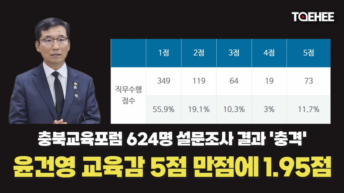 윤건영 충북교육감의 재임 3년간 직무수행 평균 점수가 5점 만점에 1.95점이라는 설문결과가 나왔습니다.
