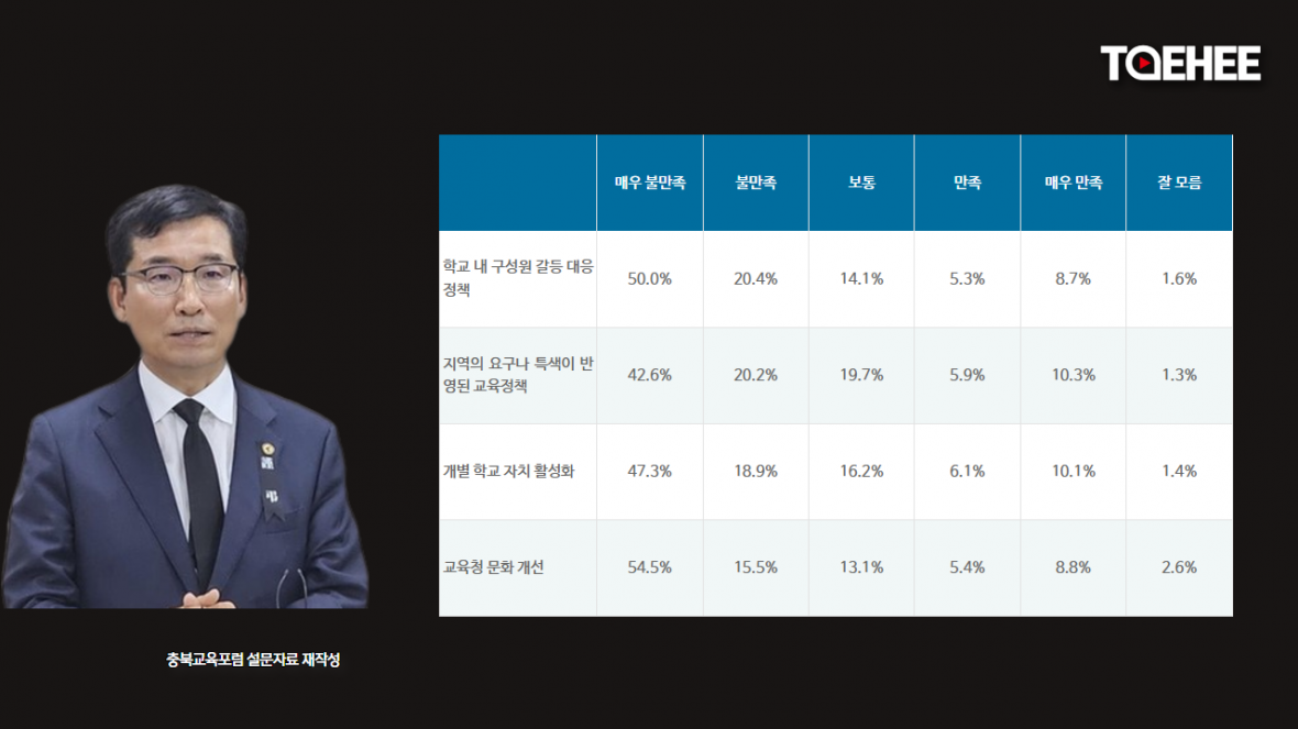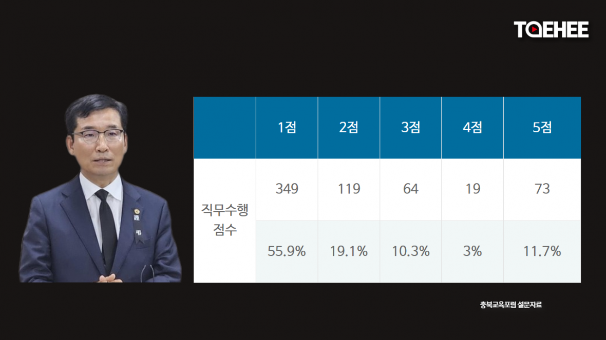 충북교육포럼은 “직무수행 전반에 걸친 부정적 평가는 윤 교육감의 직무수행에 현장의 신뢰가 뿌리째 흔들리고 있다는 것을 보여주는 것”이라고 평가했습니다.
