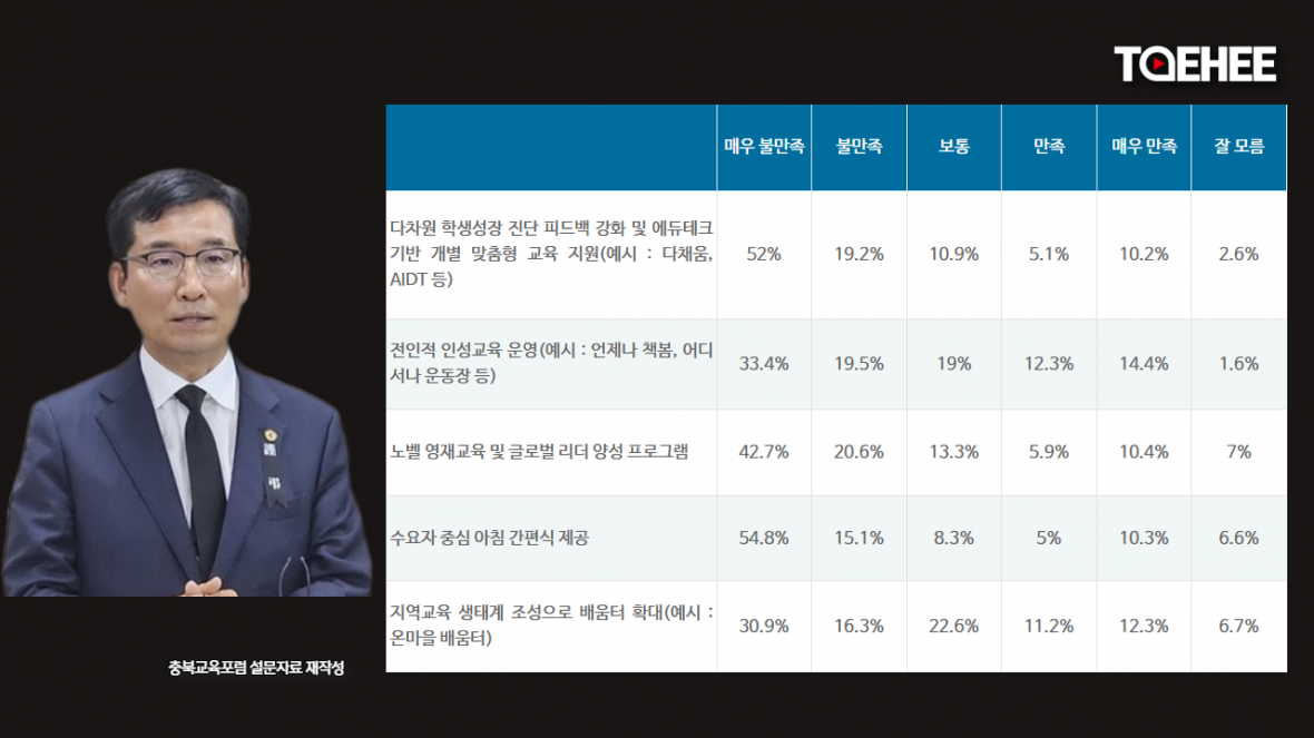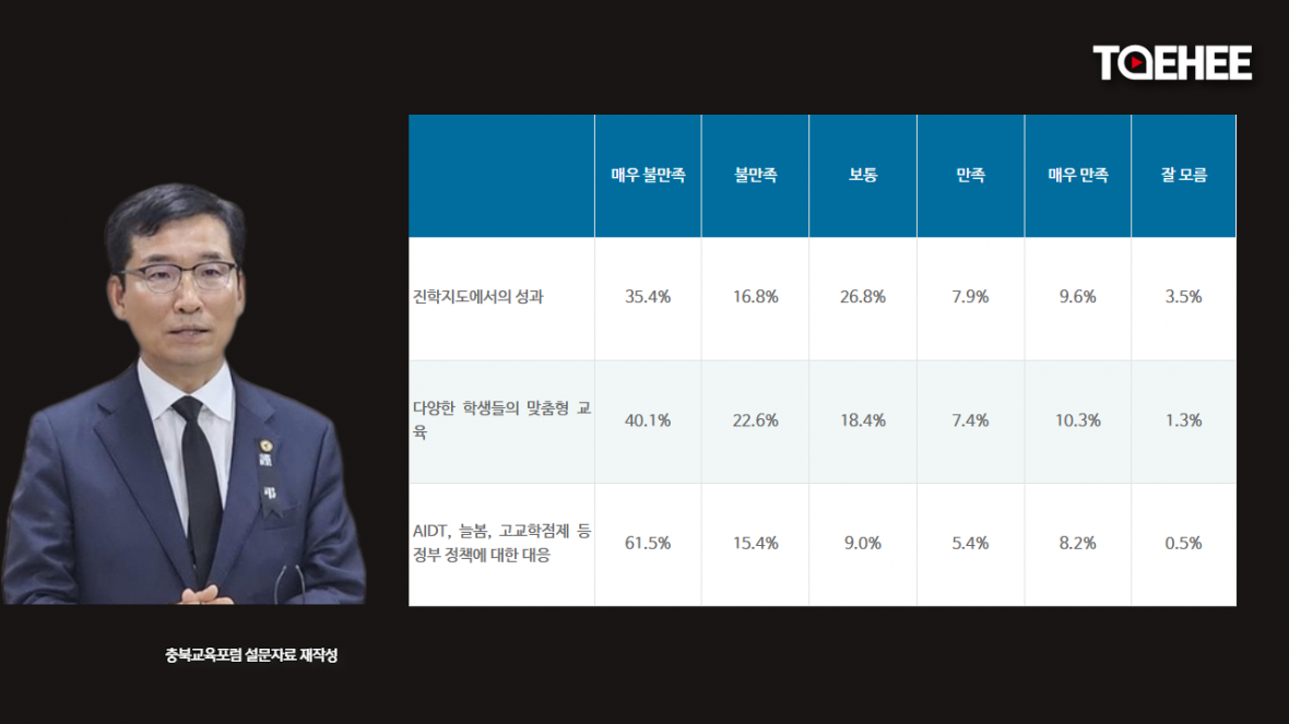 충북교육청 주요 정책에 대한 만족도 분야인 ‘AIDT, 늘봄, 고교학점제 등 정부 정책에 대한 대응’에서는 불만족 비율이 76.9%나 됐고, ‘학교 내 구성원 갈등 대응 정책’의 불만족 비율도 70.4%였습니다.