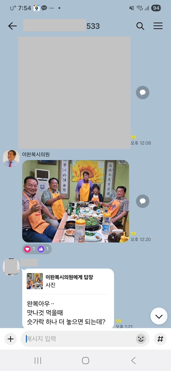 이완복 청주시의원(왼쪽에서 두번째)이 단톡방에 올린 내용캡쳐.