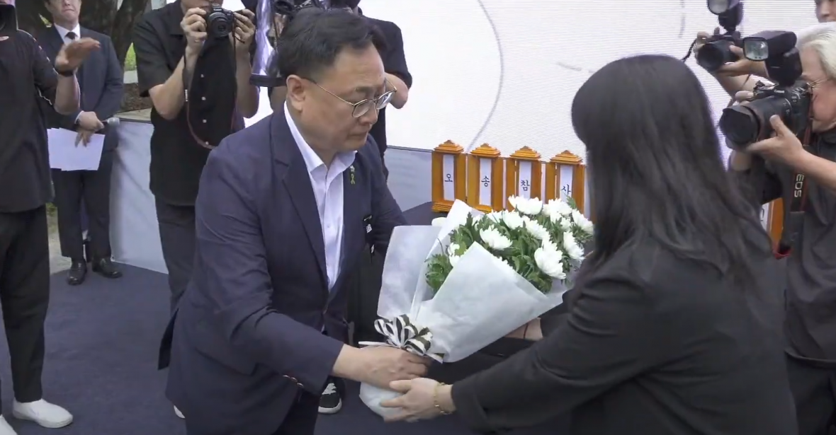 이광희 민주당 충북도당 위원장이 이재명 대통령이 보낸 조화를 유가족대표에게 전달하고 있다.