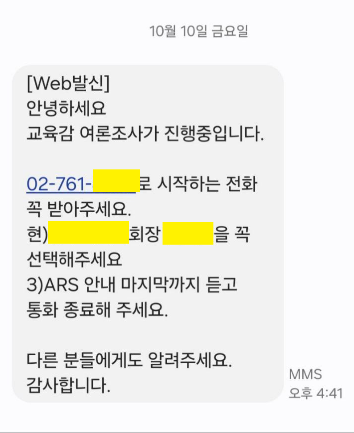 지난 10일 오후 4시 41분쯤 일부 도민들에게 ‘안녕하세요 교육감 여론조사가 진행중입니다’라는 문자메시지가 발송됐습니다.