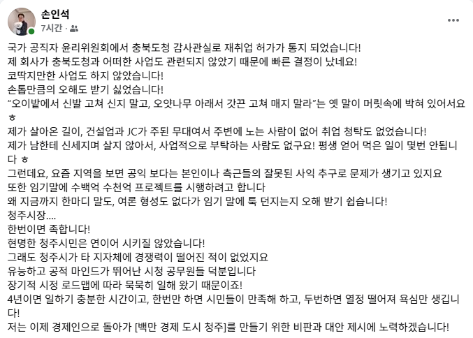 손인석 전 충북도 정무특보가 사실상 이범석 청주시장을 저격하는 글을 썼습니다.