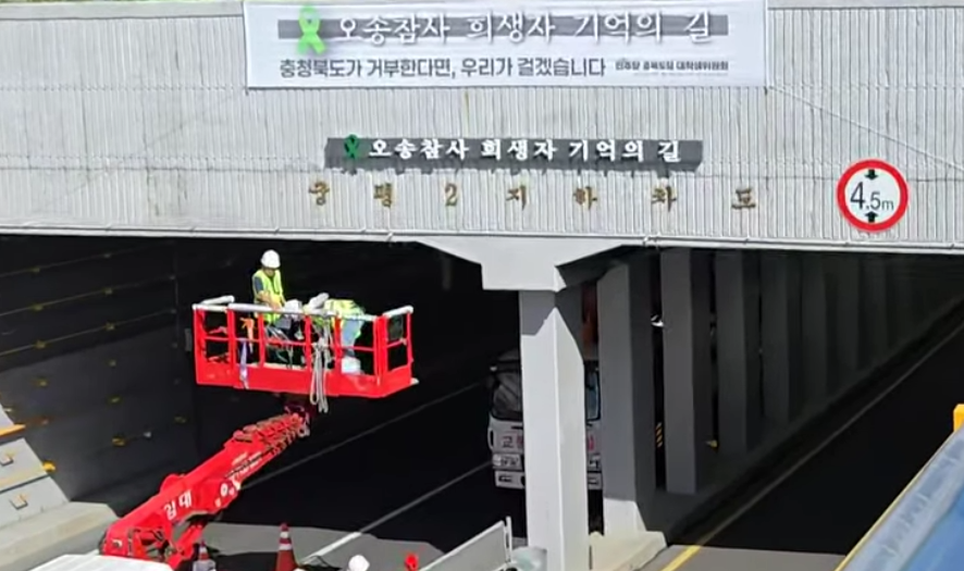 15일 충북도는 궁평2지하차도 쌍방향 입구 상단에 '오송참사 희생자 기억의 길'이라는 문구가 적힌 가로 6m, 세로 30cm 크기의 추모 현판을 설치했습니다.