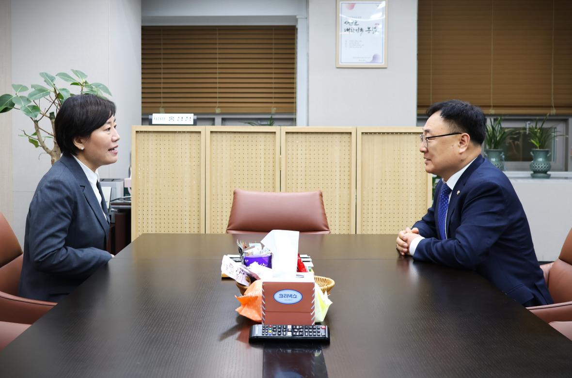 송미령 농림식품부장관(왼쪽)과 이광희 의원이 4일 국회에서 만나 농어촌기본소득 시범사업 충북제외 파문에 대한 의견을 나누고 있다./이광희 의원 제공
