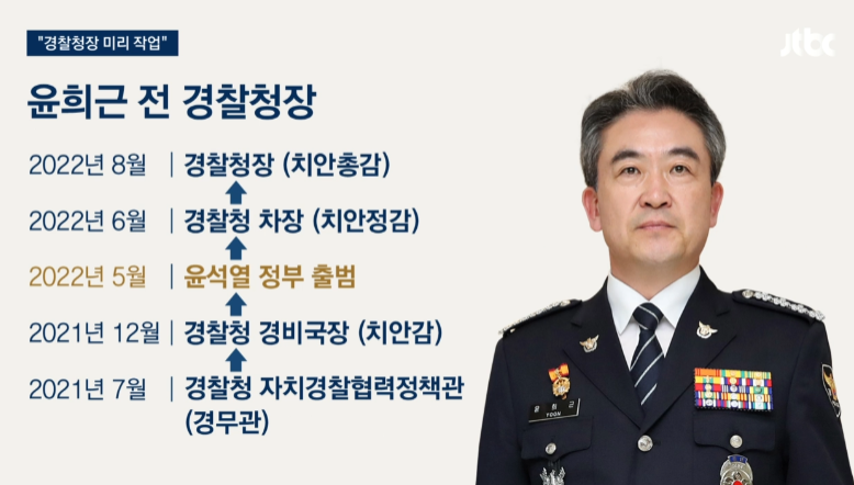 JTBC는 윤 전 청장이 2021년 12월 치안감이 된 뒤 6개월만인 2022년 6월 치안정감, 그해 7월 4일 청장에 내정되는 과정에 대해 김건희 특검이 수사에 들어갔다고 보도했습니다.