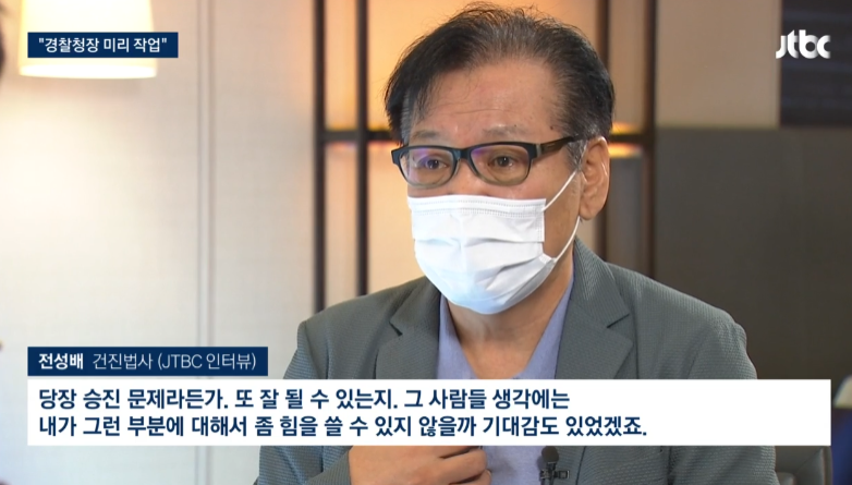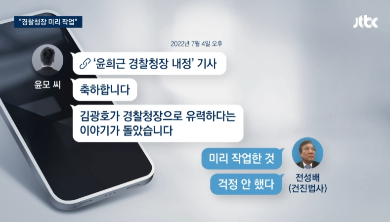 5일 JTBC는 “윤석열 정부에서 단 8개월 만에 '초고속 승진'을 했던 윤희근 전 경찰청장의 인사 과정에 건진법사가 개입한 정황이 드러났다”며 “건진법사가 ‘경찰청장 내정을 미리 작업했다’는 내용의 문자 메시지를 보낸 것으로 파악됐다”고 보도했습니다.