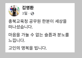 그런데 119구급대가 출동하기 전날 김영환 충북지사는 공무원 사망과 관련해 자신의 페이스북에 ‘마음을 가눌 수 없는 슬픔과 분노를 느낀다’고 썼습니다.