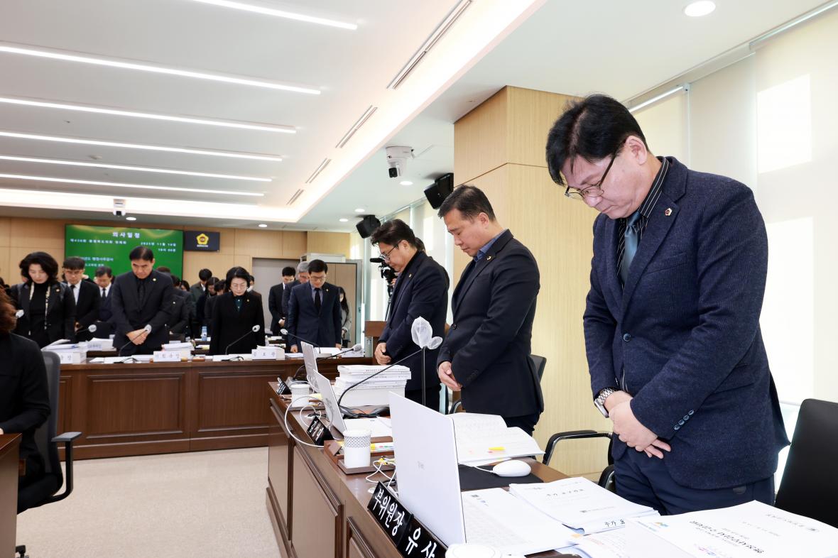 10일 속개된 충북도의회 교육위원회의 충북교육청에 대한 행정사무감사에서 도의원들과 교육청 관계자들이 최근 숨진 공무원에 대해 묵념을 하고 있다./충북도의회 제공