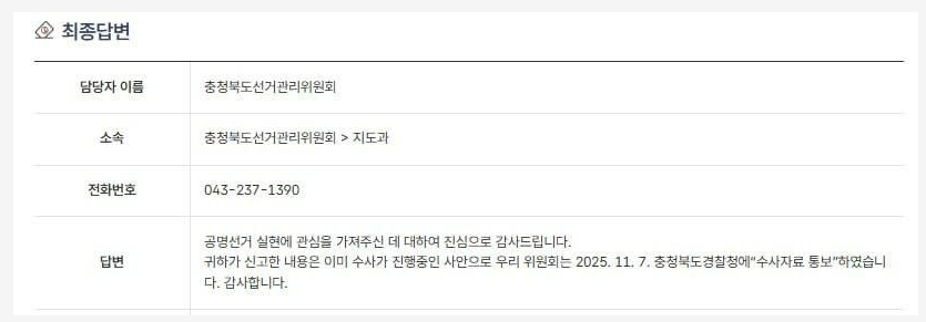 충북선관위는 최근 신고 단체에 “신고한 내용은 이미 수사가 진행중인 사안으로 11월 7일 충북경찰청에 ‘수사자료통보’했다”고 답변했습니다.