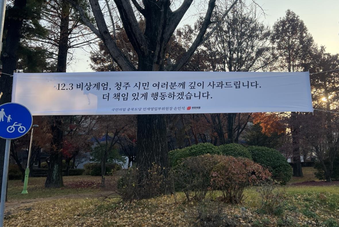 여기에 손인석 도당 인재영입부위원장은 지난 2일 청주시내 30곳에 ‘12.3 비상계엄, 청주시민 여러분께 깊이 사과드립니다. 더 책임있게 행동하겠습니다’라는 현수막을 내걸었습니다.
