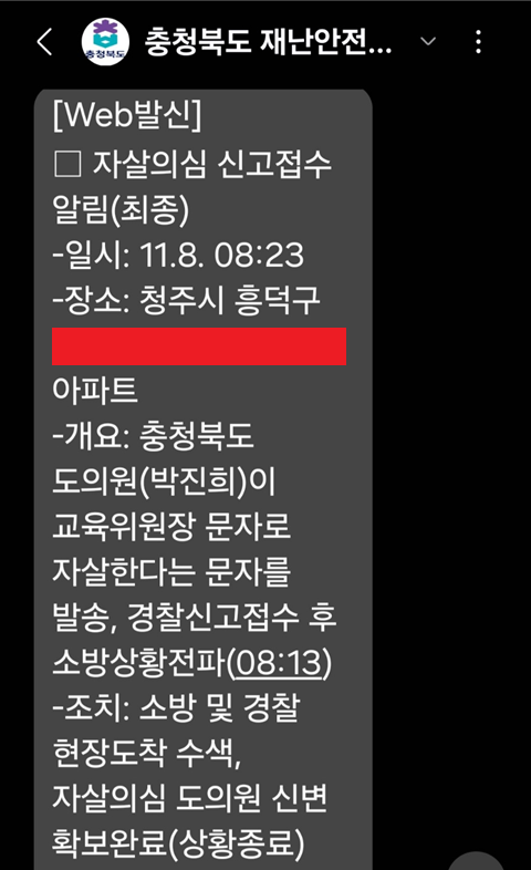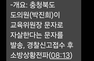 특히 ‘충북도의원(박진희)이 교육위원장 문자로 자살한다는 문자를 발송, 경찰신고접수 후 소방상황 전파’라는 내용을 담고 있습니다.