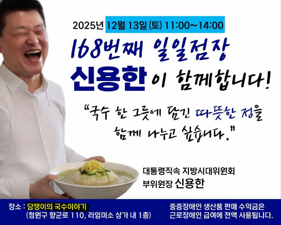 신용한 대통령직속 지방시대위원회 부위원장은 13일 오전 11시부터 오후 2시까지 중증장애인 사업장인 ‘담쟁이의 국수이야기’ 우암점에서 168번째 일일점장을 합니다.