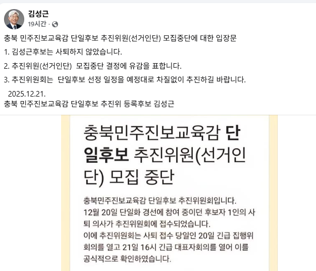 충북민주진보교육감 단일화 추진위원회(단일화 추진위)는 지난 21일 “20일 후보자 1인의 사퇴의사가 추진위원회 접수됐고, 21일 긴급 대표자회의에서 이를 공식적으로 확인했다”며 “추진위원(선거인단) 모집을 중단하고 후속절차를 검토하고 있다”고 밝혔습니다.