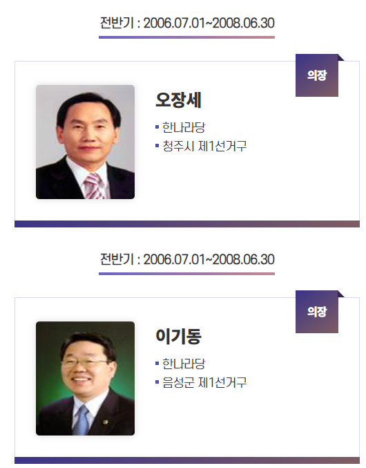 제8대 충북도의회 전반기 의장들. 2명의 의장이 있다./충북도의회 홈페이지