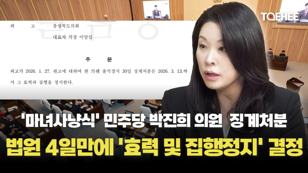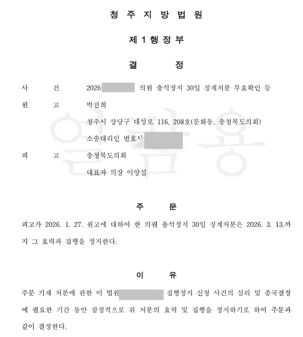 3일 청주지방법원 제1행정부(재판장 김성률)는 박 의원이 이양섭 충북도의회 의장을 상대로 낸 ’출석정지 30일 징계처분 무효확인 등‘의 소송에서 “출석정지 30일 징계처분은 2026년 3월 13일까지 그 효력과 집행을 정지한다”고 결정했습니다.