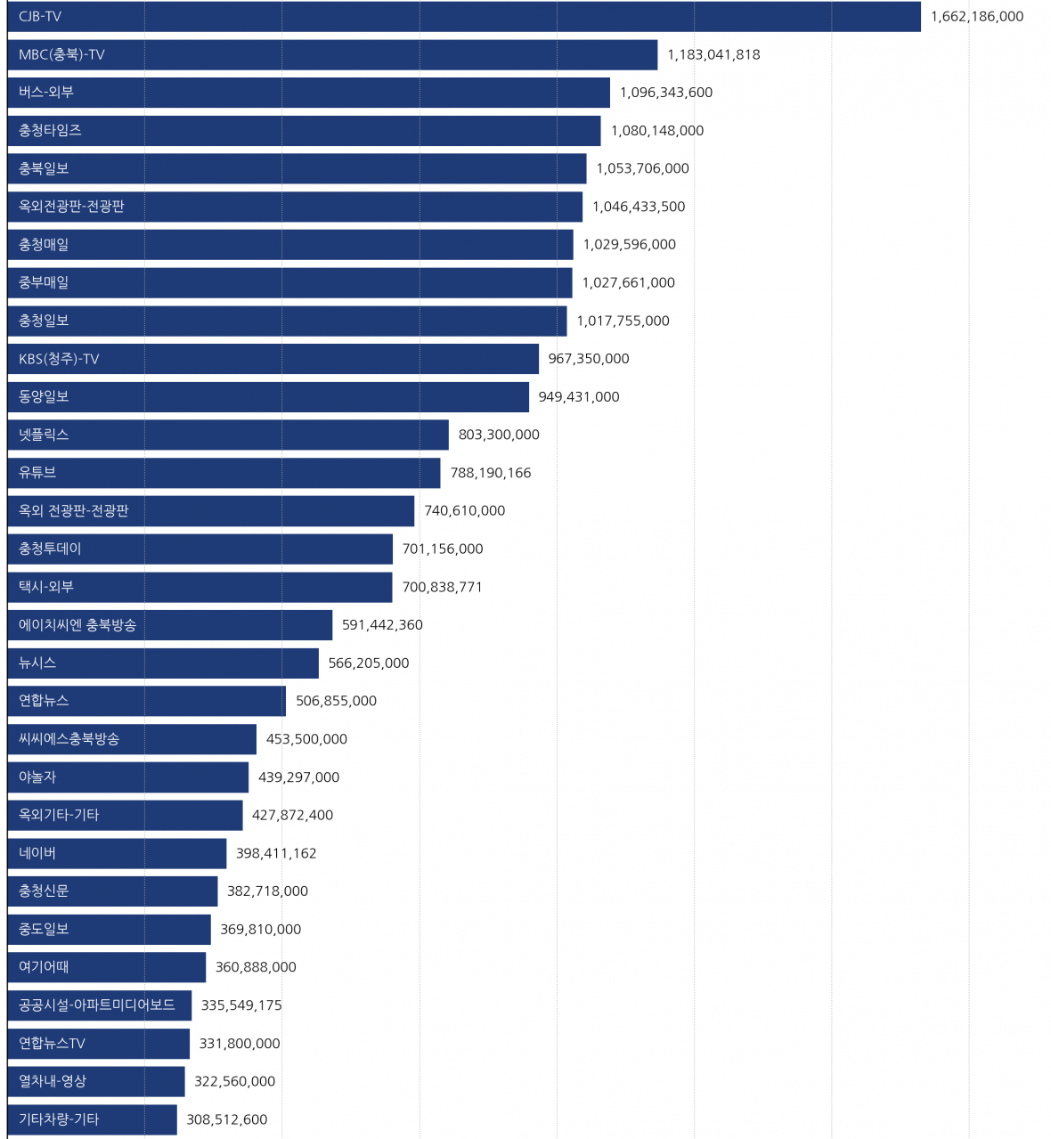 이어 MBC(충북) 118304 버스광고 10억9634만원, 충청타임즈 10억8014만원, 충북일보 10억5370만원, 옥외전광판 10억4643만원, 충청매일 10억2959만원, 충청일보 10억1775만원 KBS청주 9억6735만원 순이었습니다.