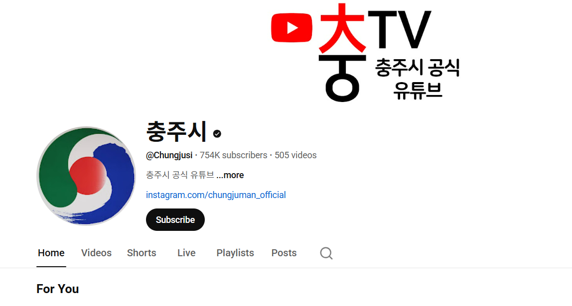 충주시 공식 유튜브인 '충TV' 메인화면. 17일 오후 4시 56분 현재 구독자수가 75만4000명이다.