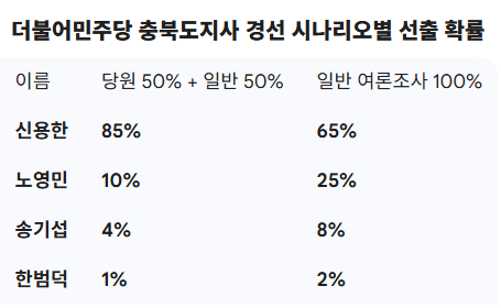 같은 자료를 받은 구글 제미나이는 ‘당원 50%+일반 50%’에서 신용한 85%, 노영민 10%, 송기섭 4%, 한범덕 1%로 전망했고, ‘일반여론조사 100%’에서는 신용한 65%, 노영민 25%, 송기섭 8%, 한범덕 2%로 예측했습니다.