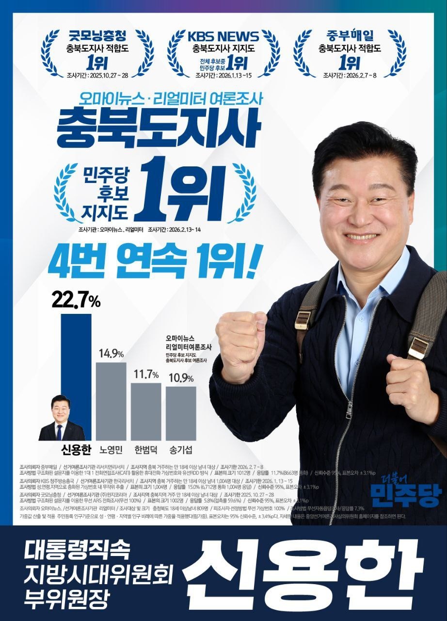 중부매일이 2월 7~8일 실시한 조사(민주당 후보 적합도, ±3.1%p)에서는 신용한 14.3%, 노영민 12.3%, 송기섭 12.2%, 한범덕 6.1%였습니다.
