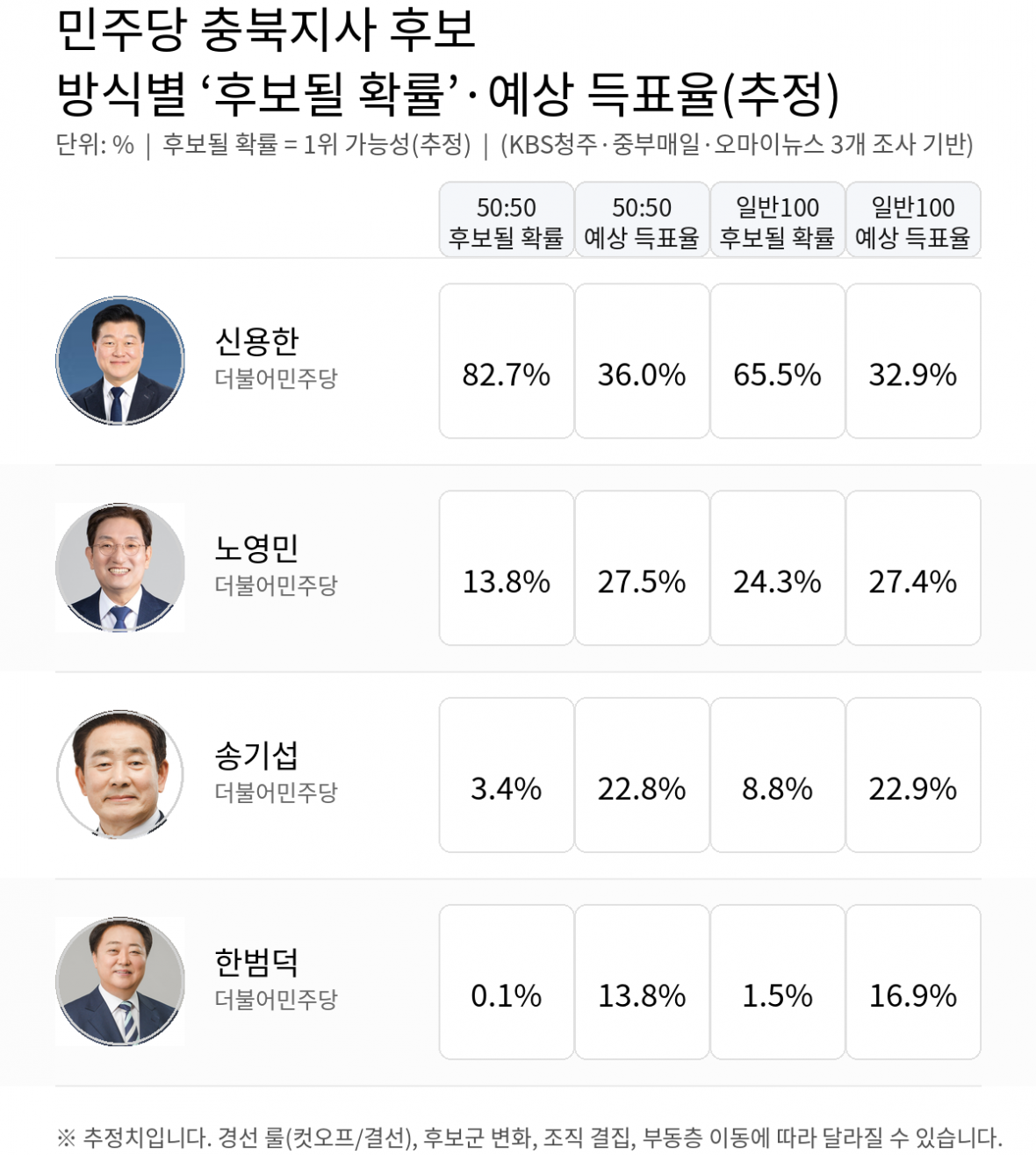 신 부위원장이 1위를 기록할 경우 대세론에 힘이 실릴 가능성이 있고, 노영민·송기섭·한범덕 3인 단일화 논의가 촉발되는 계기가 될 것이라는 전망도 나옵니다.