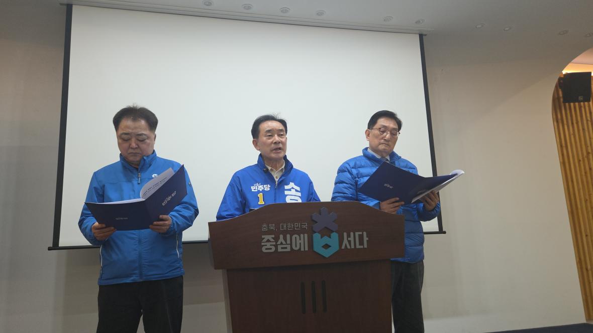지난 달 26일 충북도청 브리핑룸에서 열렸던 신용한 예비후보 규탄성명 발표 기자회견 모습.