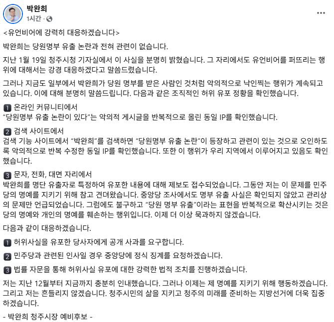 13일 박완희 청주시장 예비후보측은 당원명부 유출의혹과 관련해 자신에 대한 유언비어를 퍼트리는 사람에 대해 법적조치를 취하겠다고 공표했습니다.