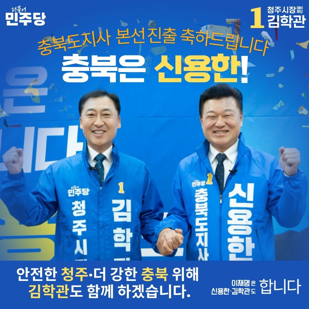 김학관 청주시장 예비후보는 “저와 신용한 후보의 정책적 비전과 강력한 추진력이 하나로 뭉쳤다”며 “신용한 후보와 함께 손잡고, 오직 시민만을 바라보며 당당히 승리하겠다”고 다짐했습니다.