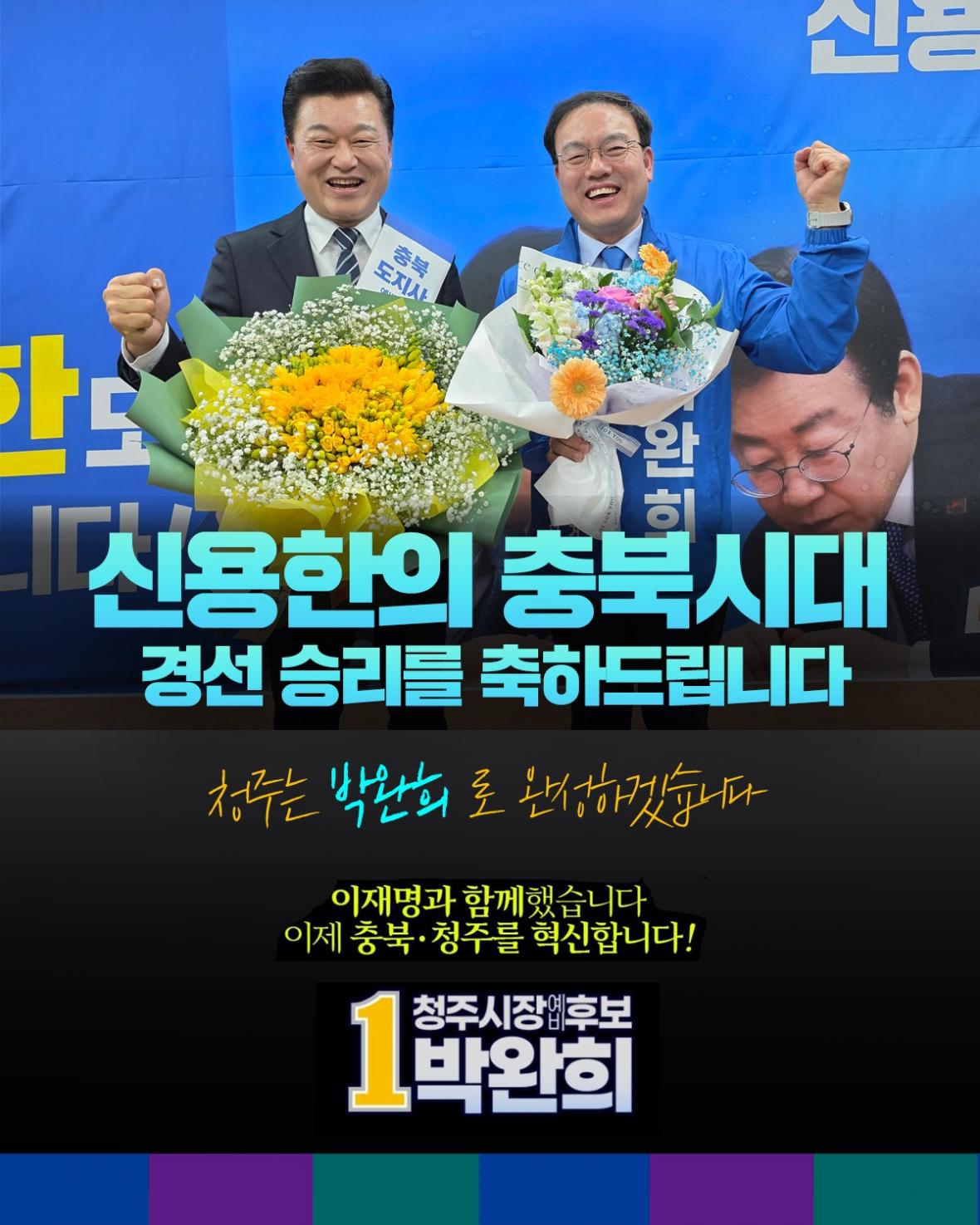 박 예비후보는 “신용한 후보의 경선 승리를 진심으로 축하드린다. 충북의 혁신과 새로운 변화에 대한 기대가 한층 커지고 있다”며 “이제 그 흐름을 이어 청주는 더 큰 도약으로 답해야 한다. (중략) 충북은 신용한, 청주는 박완희로 이어가겠다”고 밝혔습니다.