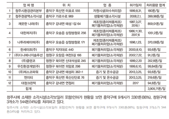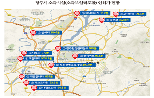현재 청주에는 총 12개의 공공‧민간 폐기물 소각장이 가동중입니다. 이 중 6개의 민간 폐기물소각장이 반경 10km 내에 밀집해 있으며 전국 소각물량의 약 18%를 처리하고 있는 실정입니다.