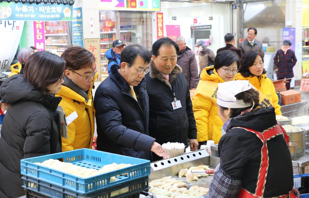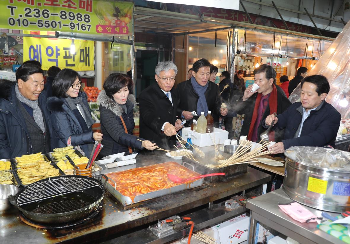 21일 장선배 충북도의회 의장(사진 가운데)과 도의원들이 청주 가경터미널시장을 찾았다. 시장 갈때는 역시 먹는게 최고, 장 의장과 도의원들은 어묵과 떡볶이집을 지나치지 못했다.