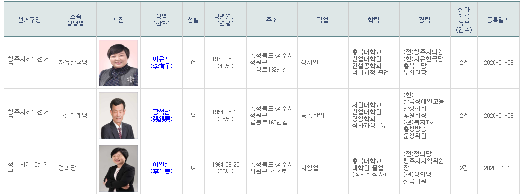 충북도의회 청주 제10선거구 보궐선거 예비후보자들./중앙선관위 홈페이지