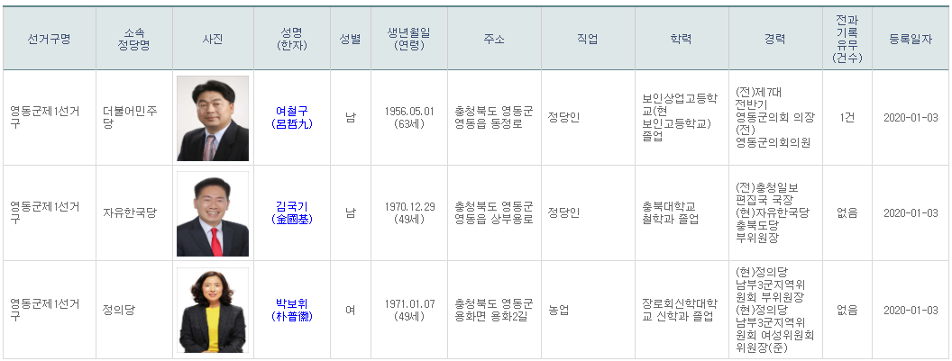 충북도의회 영동 제1선거구 보궐선거 예비후보자들./중앙선관위 홈페이지