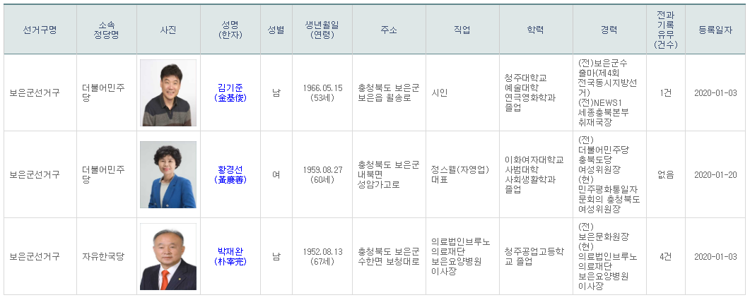 충북도의회 보은 선거구 재선거 예비후보자들./중앙선관위 홈페이지