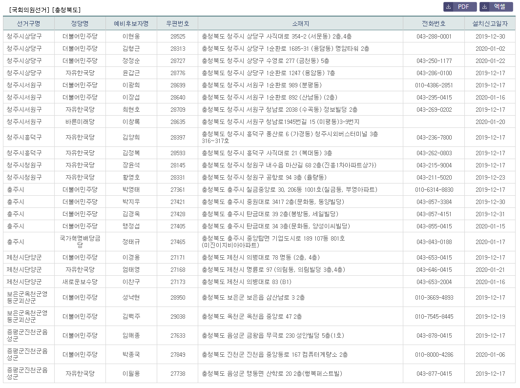 4.15 총선 충북지역 예비후보자 선거운동기구 설치내역./자료=중앙선거관리위원회