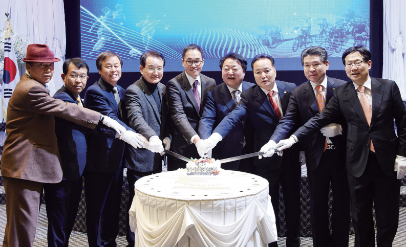 전응식 초대 민선 청주시체육회장(가운데)이 참석자들과 함께 축하케익을 자르고 있다.