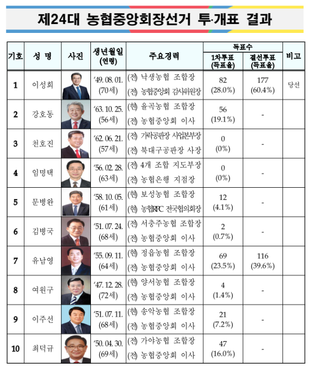 제24대 농협중앙회장 선거에서 이성희 전 경기도 낙생조합 조합장이 당선했다.