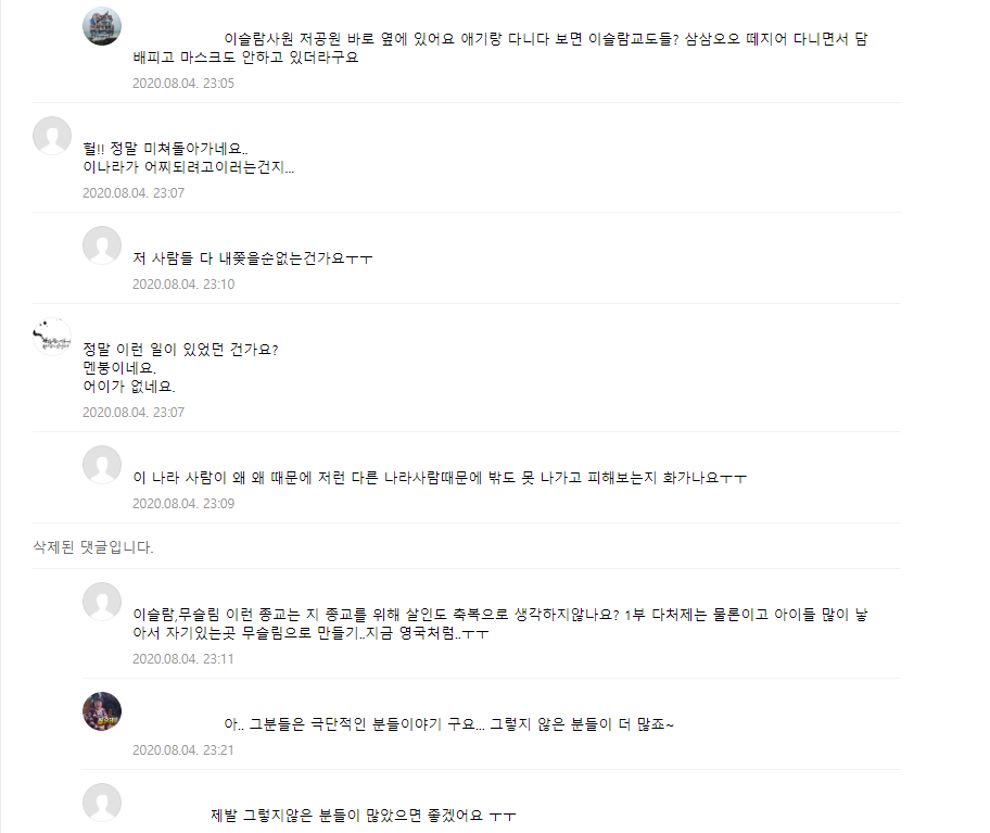 한 인터넷 카페에는 ‘이슬람교도들? 삼삼오오 떼지어 다니면서 담배피고 마스크도 안한다’, ‘저 사람들 다 내쫓을 수는 없는 건가’, ‘이 나라 사람이 왜 저런 다른 나라사람 때문에 밖도 못나가고 피해보는지 화가난다’ 등의 글이 올라와 있다.