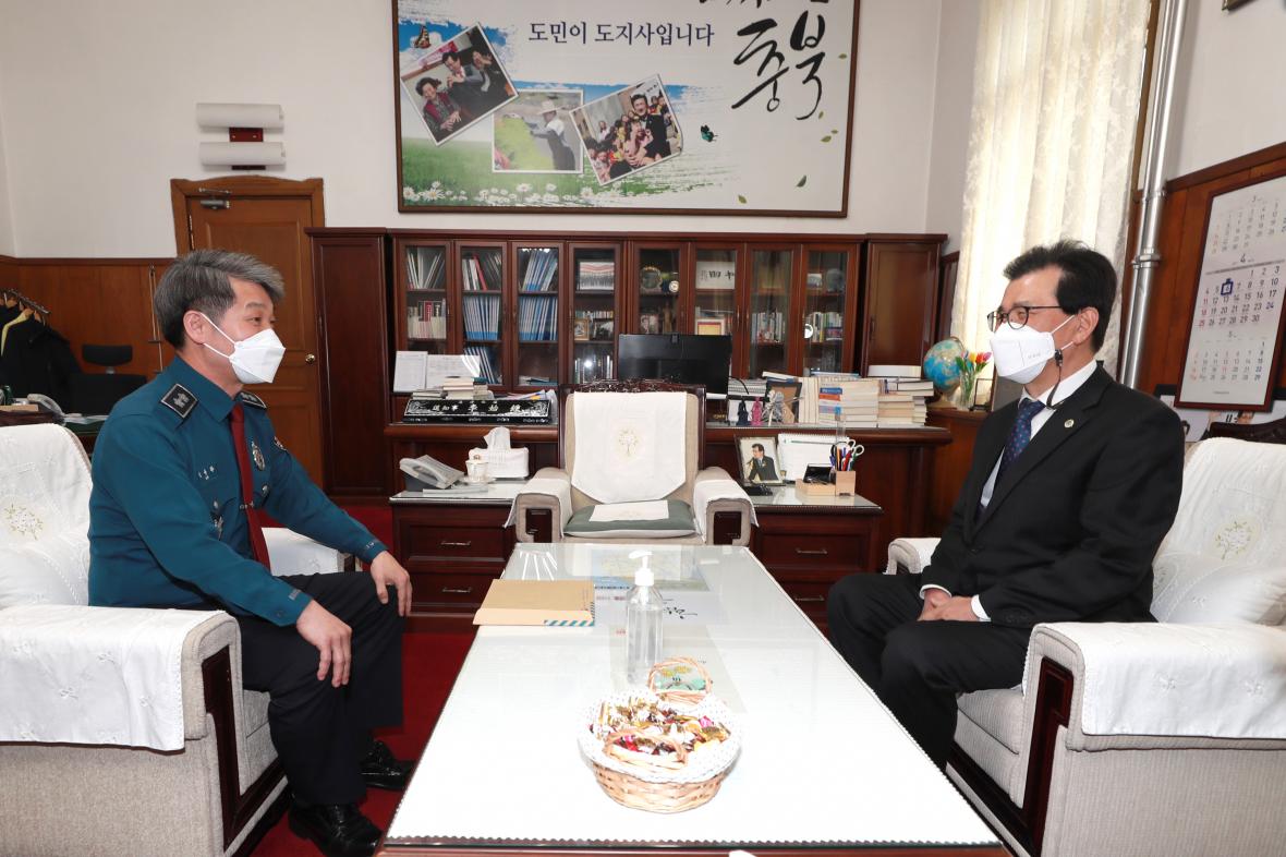 네번째 만남. 지난 6일 이시종 지사(오른쪽)와 임용환 충북경찰청장이 도지사 집무실에서 만나 자치경찰제 시행을 앞둔 현안에 대해 협의를 하고 있다. 그러나 이 만남은 양측의 입장만 확인한 채 20분만에 끝났다./충북도 제공