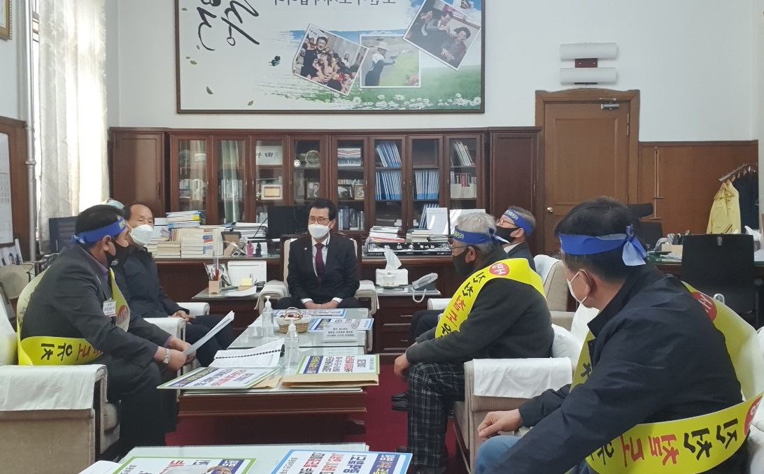 지난 달 5일 진천수도권내륙선 철도유치민간위원회 관계자들이 이시종지사를 항의방문해 '수도권내륙철도는 충북과 상관없다'는 이 지사의 발언에 대해 항의하고 있다./위원회 제공