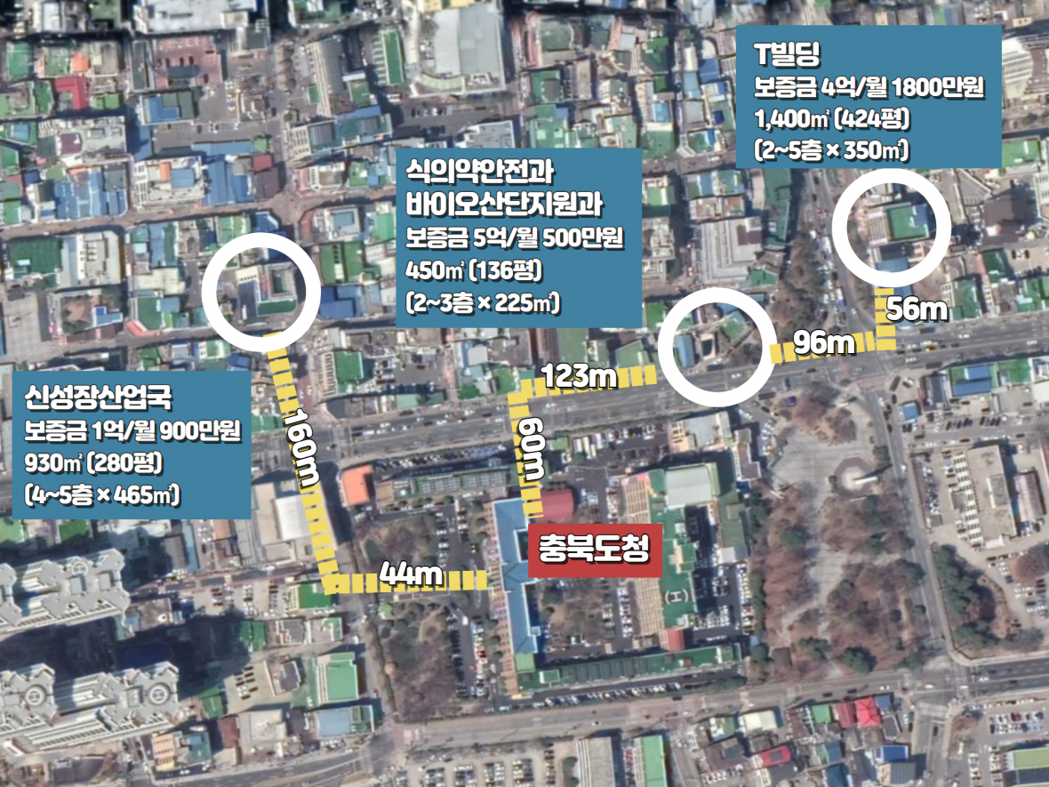 충북도의 자료에는 신성장산업국과는 본관에서 180m, 식의약안전과 건물은 170m, T건물과는 280m 떨어져 있다고 되어 있다.