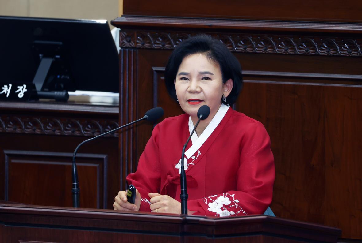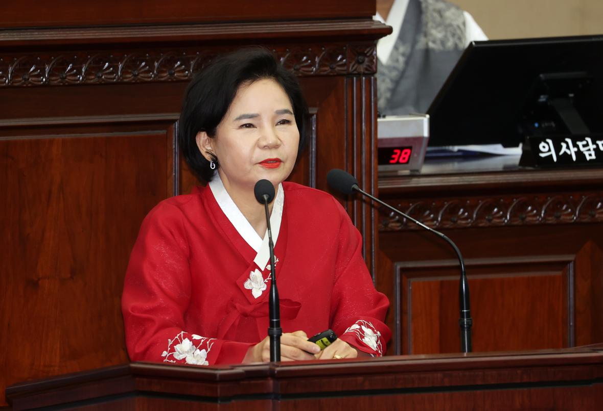 이옥규 의원이 12일 충북도의회 제1차 본회의에서 한복을 입고 5분 자유발언을 하고 있다./충북도의회 제공
