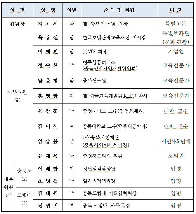 충북도립대 혁신위원회 위원 명단./충북도 제공