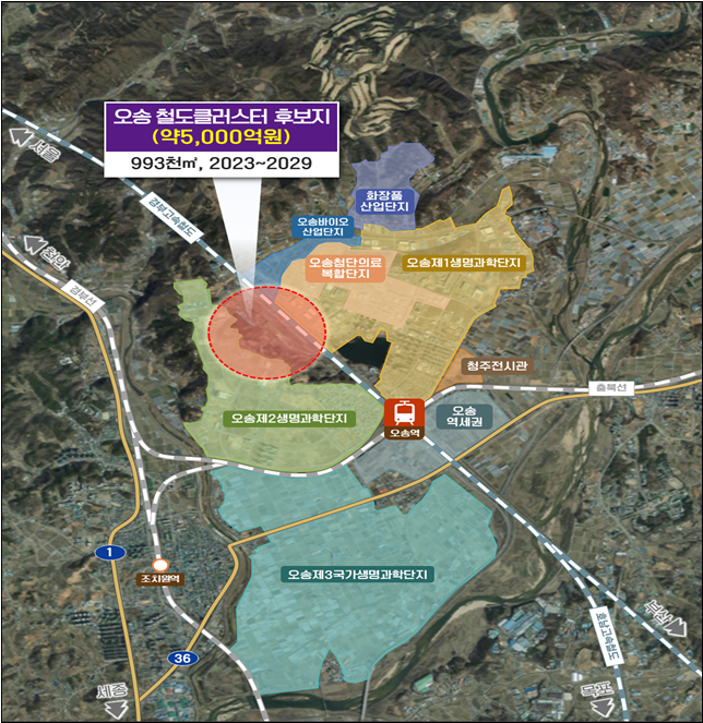 오송국가철도산업단지에는 앞으로 약 5000억원이 투입돼 미래혁신 철도R&D센터, 완성차제작단지, 경전철·트램 중정비센터, 스마트 제2철도관제센터, 미래철도 인재센터, 스마트 종합물류센터 등이 들어설 예정이다.