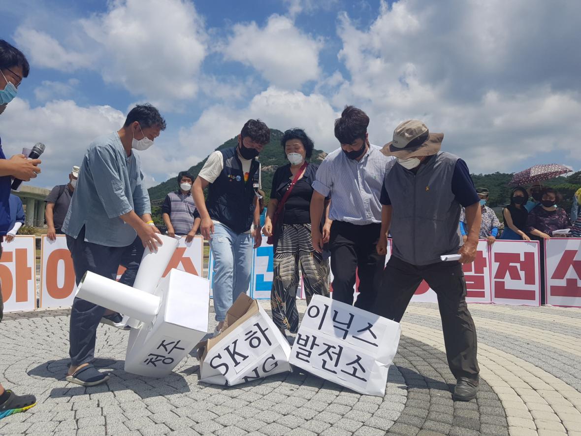 지난 2020년 7월 11일 미세먼지 해결을 위한 충북시민대책위원회가 청와대앞에서 주최한 청주 SK하이닉스 LNG발전소 건설 반대’ 기자회견에서 참가자들이 퍼포먼스를 하고 있다./미세먼지충북시민대책위 제공