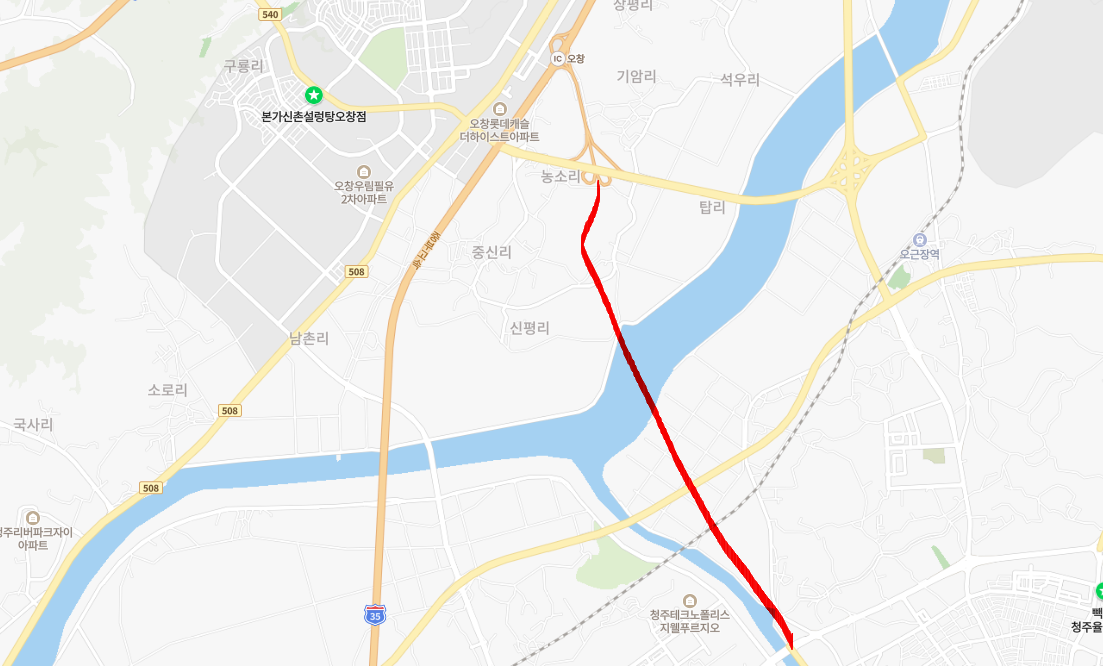 오창IC~청주 무심동로 도로개설 위치도(빨간선)
