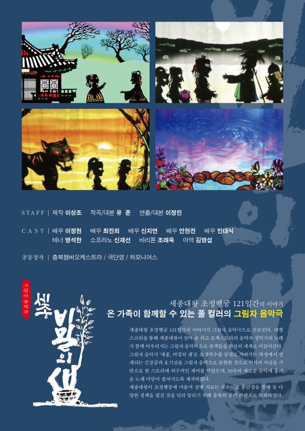 또한 대한민국 최고의 그림자극 연출자인 이정민의 연출과 작곡가 유준, 예술감독 김남진, 자문에 변광섭 청주문화재단 대표이사가 참여했다.