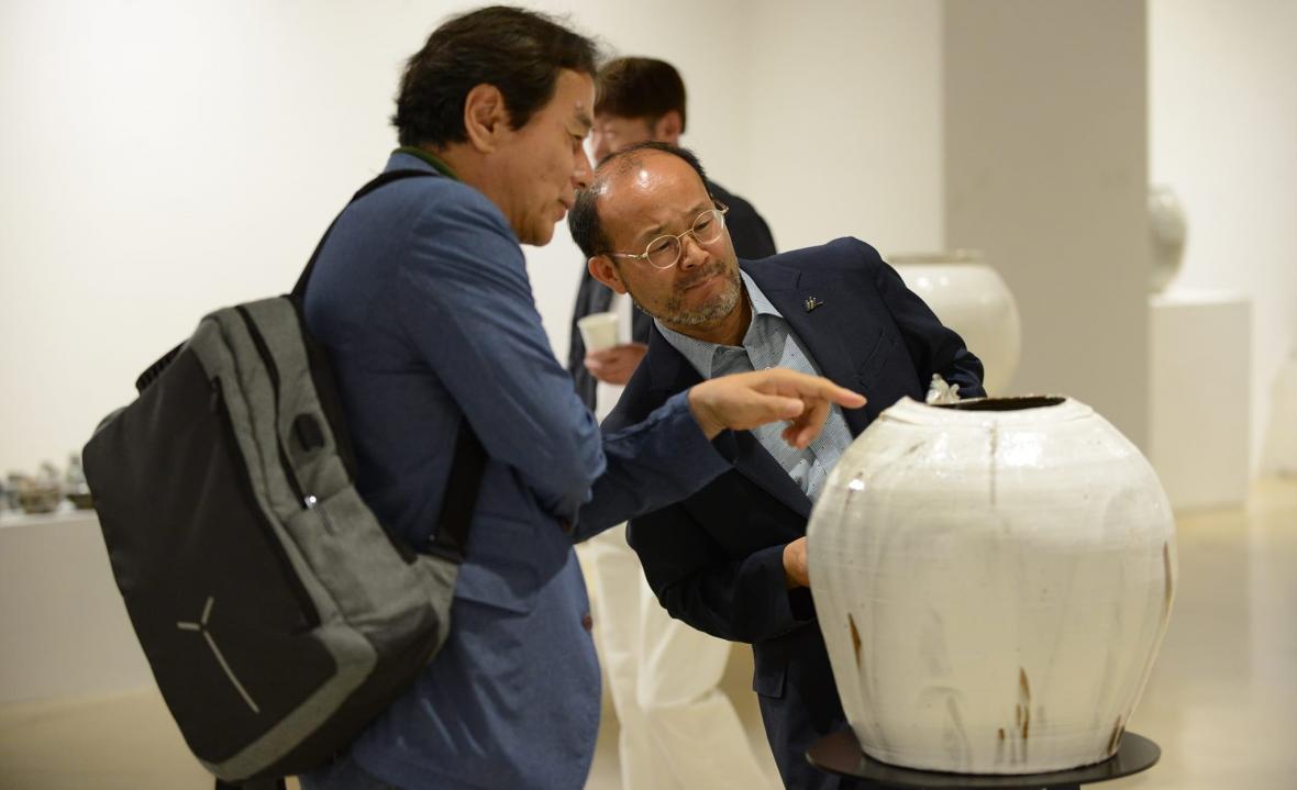 작품을 감상하고 있는 변광섭 청주시문화산업진흥재단 대표(오른쪽)
