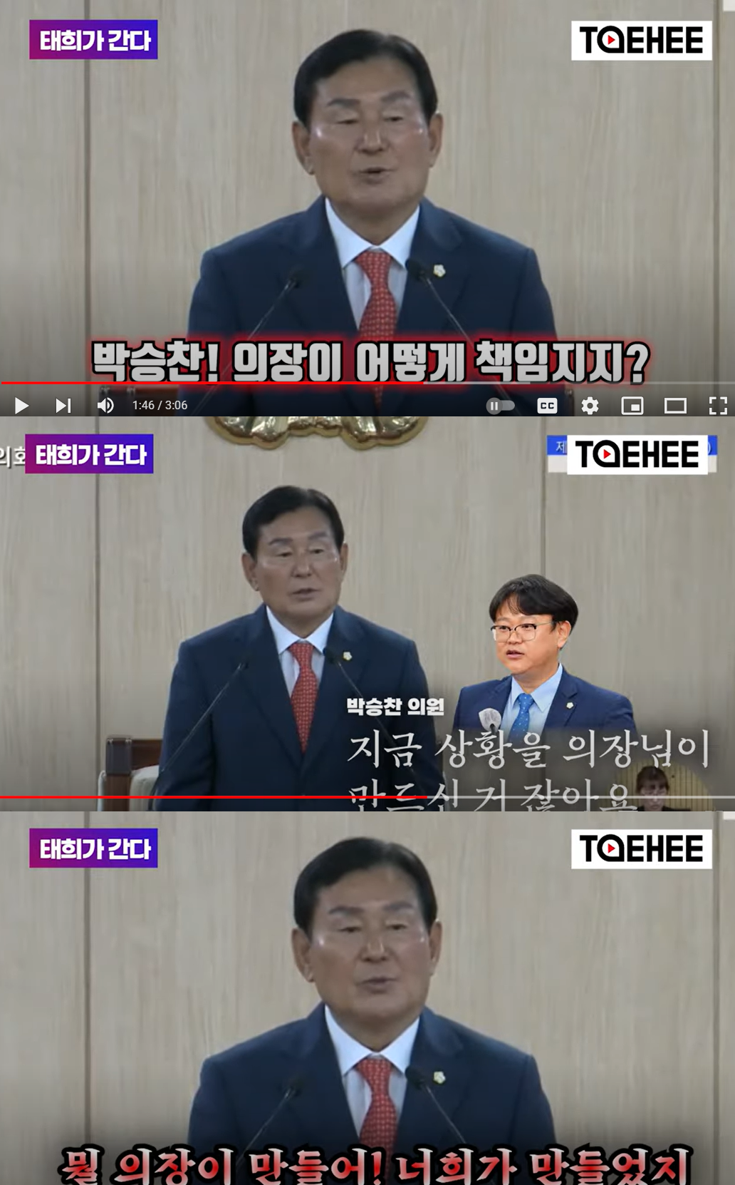지난 달 열렸던 청주시의회 본회의에서 설전을 벌이고 있는 김병국 의장과 박승찬 의원간의 설전 모습 <소셜미디어태희> 캡쳐 화면.