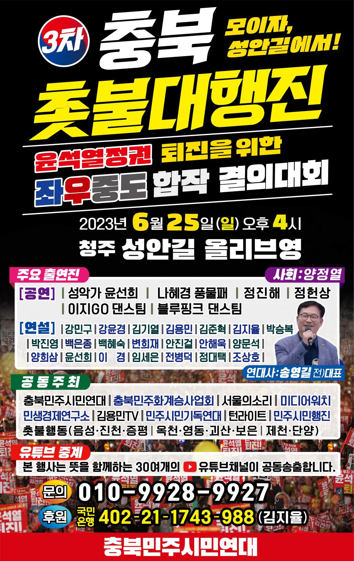 충북민주시민연대는 오는 25일 오후 4시부터 청주 성안길에서 ‘3차 충북 촛불대행진 윤석열정권 퇴진을 위한 좌우중도 합작 결의대회’가 열린다고 21일 밝혔다.